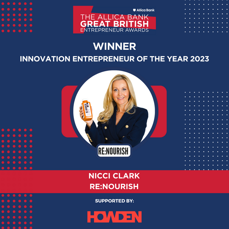 NOVEMBER : WINNER WINNER! Nicci won Innovation Entrepreneur of The Year 2023 at the Great British Entrepreneur Awards. These awards are billed as the "Grammy's for Entrepreneurs" This is a huge accolade with over 5000 entries. The judges comments: "RE:NOURISH is a remarkable solution of our time, catering to the health-conscious and environmentally aware society. With substantial growth in a short period and strong prospects for the future, RE:NOURISH stands out as an innovative response to the growing awareness of nutrition and well-being. The brand exhibits the potential to reach tremendous heights, and the judges wish Nicci and RE:NOURISH all the best" Team RE:NOURISH are certainly celebrating this might win. 🌟🌟❤️